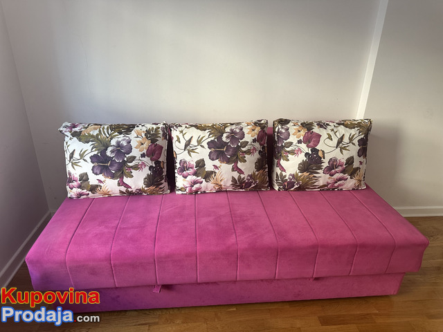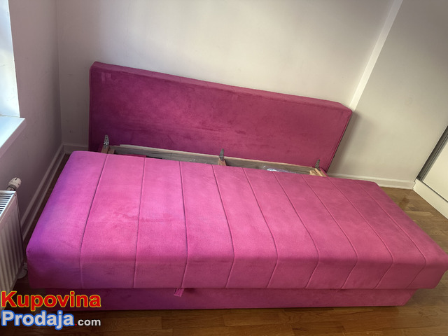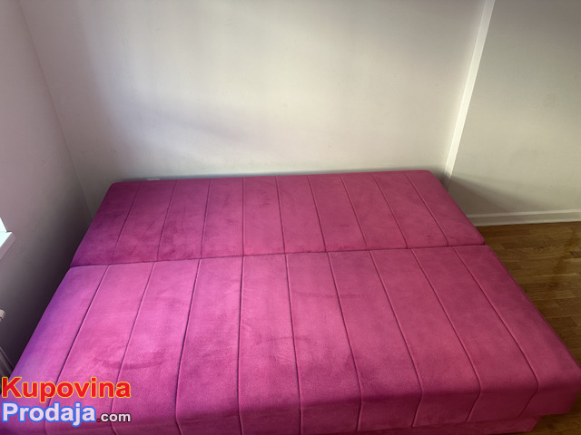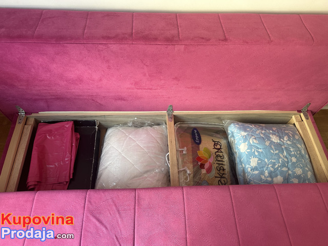 Krevet na rasklapanje u roze boji sa fiokama za odlaganje jastuka , posteljine .